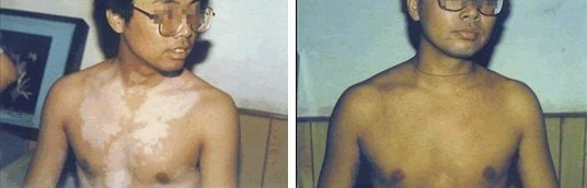郑州肤康皮肤病研究所就诊,采取口服药物和外用药结合的治疗方案,治疗半个月后白斑面积明显缩小,治疗一个月后胸部白斑消失,留有一定的色素沉着,比正常皮肤颜色稍深.继续治疗,40天后,腹部颜色恢复正常.