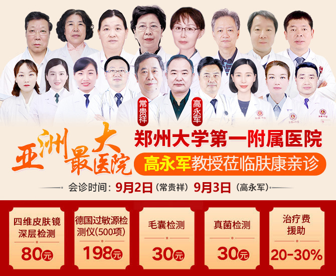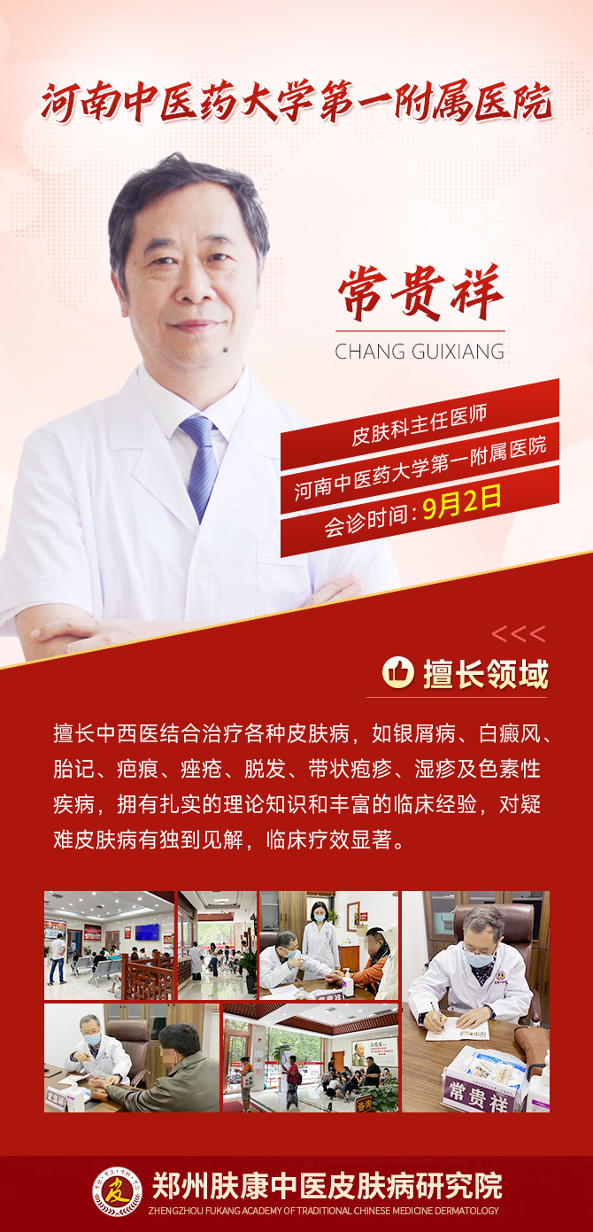 为让河南广大皮肤病患者得到专业、规范的治疗,郑州肤康皮肤病医院特邀河南中医药大学第一附属医院常贵祥教授、郑州大学第一附属医院高永军教授于9月2-3日临我院会诊。望借此机会切实帮助皮肤病患者治疗得当,提高诊疗效果