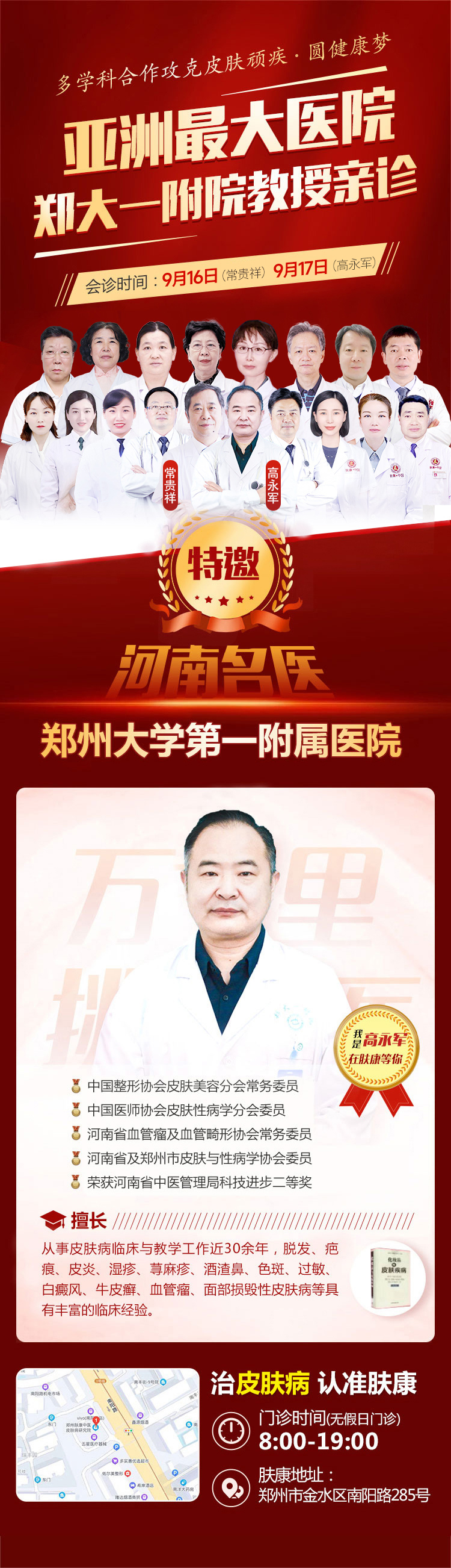 特邀常贵祥教授、高永军教授于9月16-17日莅临郑州肤康会诊。